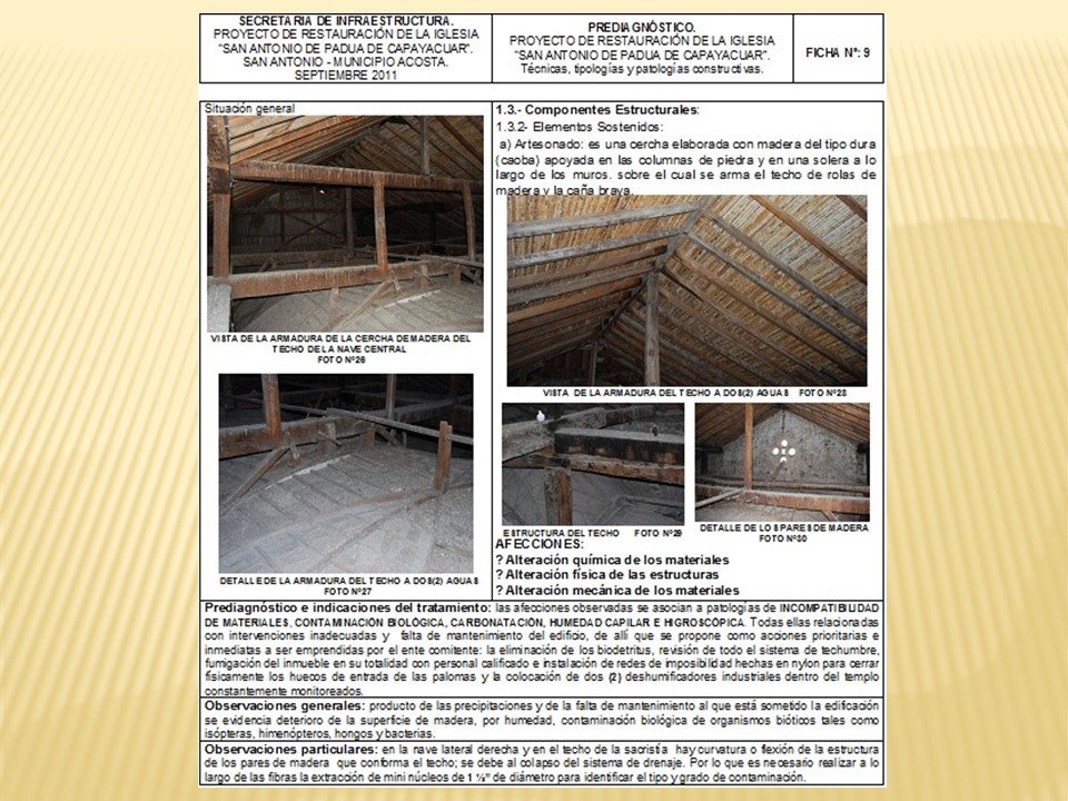 En este proyecto se aplicó la ficha de prediagnóstico para el reconocimiento, levantamiento y descripción de las manifestaciones de las distintas alteraciones en los materiales constitutivos: piedra coralina y adobe.